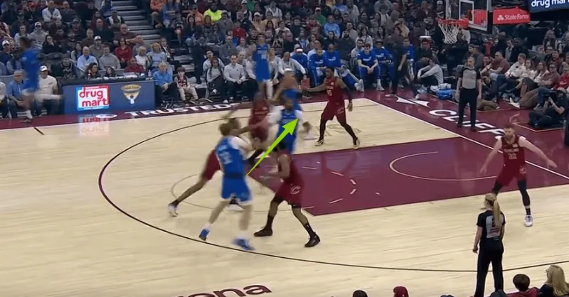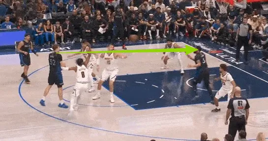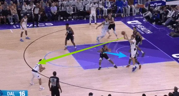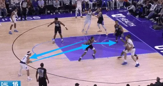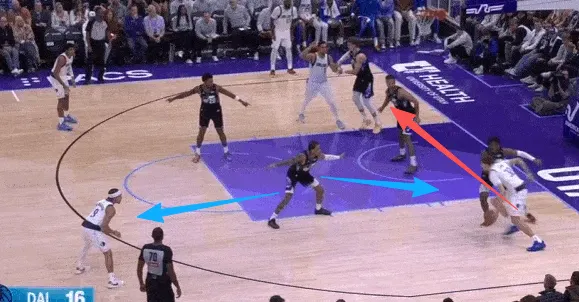 挡拆行进间吸引到双人夹击的瞬间、赶在乔治换防到顺下加福德前,立即跳传找到顺下的加福德。
